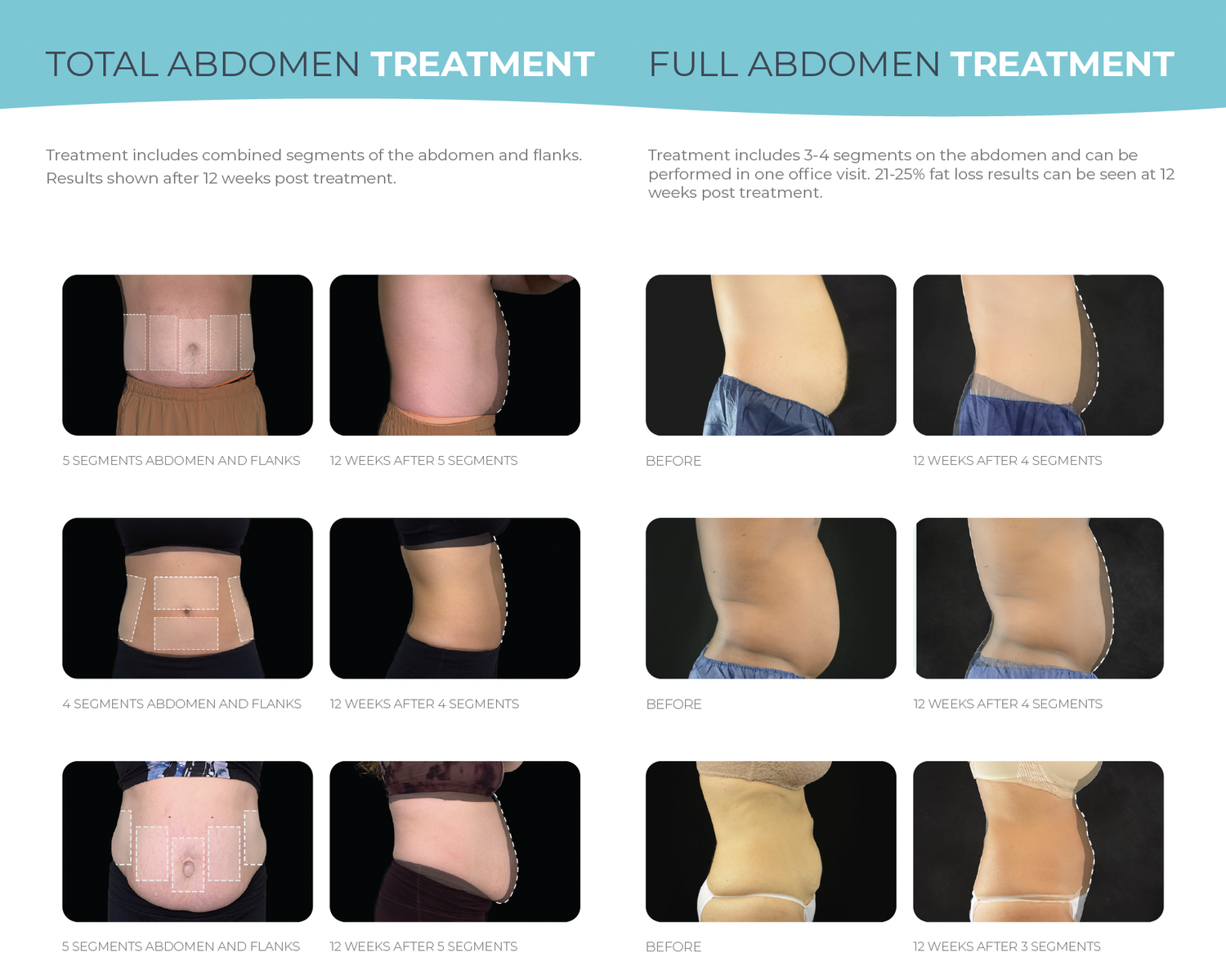 Although results vary among individuals, studies show patients experienced 21-25% average fat reduction after an EON treatment. Some patients lost as much as 40%. Best results are seen at 12 weeks.